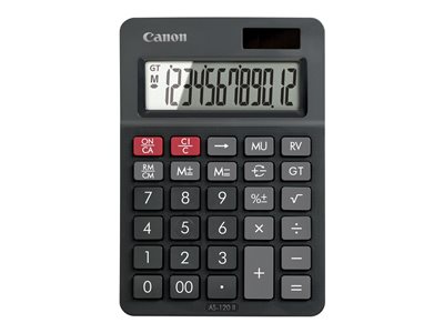 L'AS-120 II est une calculatrice de bureau dotée d'un écran inclinable de 12 chiffres. Elle prend également en charge les fonctions de marquage et d'inversion. La fonction unique de mémoire avec total général facilite l'exécution de calculs complexes en stockant des montants partiels et en calculant le total général par simple pression d'un bouton. Certaines pièces de la calculatrice AS-120 II ont été fabriquées à partir de matériaux dérivés de produits Canon recyclés.