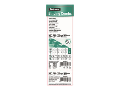 19 mm - 30 cm - A4 (210 x 297 mm) - 150 feuilles - blanc - 100 unités peigne de reliure en plastique - pour Fellowes Galaxy 500, Orion 500, Pulsar+ 300, Quasar+ 500, Star+ 150, Starlet 2+