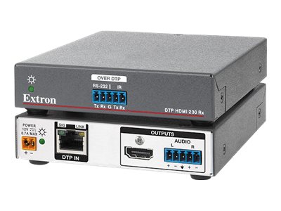Le DTP HDMI 4K 230 Rx Extron est un récepteur paires torsadées numérique qui fonctionne avec les produits Extron équipés DTP pour la transmission des signaux HDMI, audio, RS-232 bidirectionnel et IR, jusqu'à 70 mètres sur un câble CAT-x blindé. Il offre une solution économique et efficace pour transmettre sur de longues distances les signaux vidéo numériques avec audio multicanaux embeddé depuis des équipements HDMI. En outre, le DTP HDMI 4K 230 Rx accepte des signaux audio stéréo analogique depuis un produit équipé DTP via le même câble paires torsadées blindé. Il accepte les résolutions vidéo jusqu'à 4K. La taille compact du boîtier et la possibilité d'alimentation à distance, rendent le DTP HDMI 4K 230 Rx idéal pour un placement discret dans des pupitres, derrière des écrans tactiles, ou n'importe où il est nécessaire pour répondre aux exigences des applications.Le DTP HDMI 4K 230 Rx, conforme à la norme HDCP permet une transmission fiable des signaux HDMI, et accepte le Deep Color jusqu'à 12 bits, le passage du CEC, et les formats audio sans perte HD embeddés. De plus, la communication DDC d'EDID et d'HDCP est maintenue en continu entre la source et l'écran ou le projecteur pour assurer une compatibilité directe et la transmission optimale des signaux entre les appareils. Le DTP HDMI 4K 230 Rx reçoit également l'audio stéréo analogique depuis une grille de commutation équipée DTP, un sélecteur ou un processeur de signal. Le signal audio stéréo analogique est envoyé via le même câble paires torsadées blindé que les signaux HDMI et de contrôle, ce qui rend inutile l'utilisation d'un câble séparé pour permettre l'audio analogique au récepteur.Le récepteur paires torsadées offre d'autres fonctionnalités pratiques et conçues pour simplifier l'intégration. Le DTP HDMI 4K 230 Rx accepte la transmission simultanée des signaux IR et RS-232 bidirectionnel provenant d'un système de contrôle pour le contrôle des appareils AV. De plus, le récepteur peut être alimenté à distance via un câble paires torsadées blindé par un produit équipé DTP, permettant aux deux appareils de partager la même source d'alimentation.