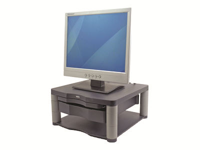 Supporte les moniteurs de type CRT ou TFT/LCD pesant jusqu'à 36 kg (21"). Fabriqué à partir de plastique 100% recyclé. Positionne l'écran à une hauteur de vue confortable et permet d'organiser le poste de travail autour de l'écran. Equipé d'un tiroir de rangement de 51mm et d'un porte-copies intégré. Réglable sur 5 hauteurs de 64mm à 165mm. Graphite.