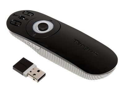 Ne vous embarrassez pas de câbles ou de l'ordinateur ; présentez-vous comme un professionnel et contrôlez votre ordinateur à distance à l'aide d'un seul appareil - la télécommande de présentation multimédia Targus avec contrôle du curseur. Grâce à la technologie sans fil 2,4 GHz de la télécommande, vous pouvez accéder aux programmes, lancer Internet, régler les volumes et lire de la musique et des vidéos, le tout à une distance maximale de 15 mètres. La télécommande de présentation multimédia Targus vous permettra de vous concentrer sur votre présentation, sans craindre de faire des erreurs - la technologie KeyLock brevetée du système verrouille les touches non essentielles, ce qui signifie que vous ne pouvez pas appuyer dessus accidentellement. Vous pouvez vous déplacer et suivre la présentation à votre rythme. Vous pouvez même tamiser la lumière si nécessaire, car la télécommande est dotée de touches rétroéclairées pour une utilisation dans des environnements peu éclairés. Les commandes faciles à guider et le curseur vous permettront d'accéder à votre ordinateur et de faire avancer votre présentation de manière fluide et efficace. Le mini-récepteur USB se range parfaitement à l'intérieur de la télécommande lorsqu'elle n'est pas utilisée pour plus de commodité, afin de ne pas être perdu ou endommagé. Présentez de manière professionnelle avec la télécommande de présentation multimédia Targus avec contrôle du curseur.