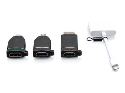 La boucle d'adaptateurs 4K HDMI à support universel rétractable en attente de brevet est le complément parfait des salles de conférence, espaces de travail, amphithéâtres ou salles de classe pour être sûr que tout le monde soit connecté. La configuration standard comprend des adaptateurs permettant de connecter pratiquement tous les appareils à l'écran dans la salle, tout en prenant en charge une résolution vidéo jusqu'à 4K. Selon vos besoins de connectivité, choisissez une connexion HDMI vers DisplayPort, Mini DisplayPort, USB-C ou Lightning.Adaptateurs avec code couleurLa bande colorée de ces adaptateurs DisplayPort, Mini DisplayPort et USB-C vous fait gagner du temps et vous évite toute frustration en vous aidant à identifier l'adaptateur dont vous avez besoin.Languette intégréeSaisissez rapidement vos adaptateurs au moment où vous en avez besoin grâce à la languette intégrée qui peut être personnalisée avec le logo de votre entreprise ou de votre organisation. Une quantité minimum de commande est applicable aux languettes personnalisées.Support universel rétractableLe support universel rétractable se fixe sur toutes les surfaces plates comme les tables ou les pupitres, pour vous apporter une souplesse de montage parfaitement adaptée à votre environnement. Extensibles jusqu'à 1,5 m, soumis à plus de 20 000 cycles d'extension servant à confirmer sa longue durée de vie, le rétracteur veille à ce que les adaptateurs soient toujours à portée de main et prêts à servir.Outils inclusL'outil de montage est inclus pour simplifier le processus.