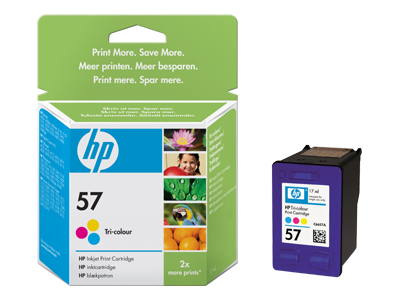 Les cartouches d'impression 3-couleurs HP 57 offrent des couleurs remarquables et homogènes, adaptées à une vaste gamme d'applications. La cartouche, fiable et simple à installer, et les encres brevetées fonctionnent avec l'imprimante HP pour des photos saisissantes de réalisme, ainsi que des couleurs d'une remarquable précision.