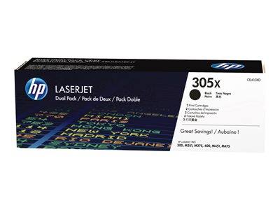Les lots de deux cartouches de toner HP LaserJet 305X d'origine offrent une qualité d'impression professionnelle plus économique que les cartouches individuelles. Imprimez et économisez davantage. Restez productifs et réduisez les temps d'arrêt en conservant une cartouche de toner supplémentaire à proximité.