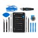 3 outils d'ouverture, 6 choix d'ouverture, bracelet antistatique, pincettes courbes ESD-safe, pincettes droites ESD-safe, spudger en métal, pince inversée en nylon, petite ventouse, outil de câblage, spatule hallebarde, 64 embouts de tournevis, outil d'ouverture Jimmy, tampon magnétique