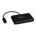 Voici l'accessoire indispensable si vous possédez un ordinateur doté de ports USB-C et que vous avez besoin de ports USB-A supplémentaires. Ce hub USB 3.0 portable augmente les capacités de connexion de votre ordinateur portable ou de bureau en ajoutant quatre ports USB Type-A via un seul port USB Type-C ou Thunderbolt 3. Son alimentation par bus élimine la nécessité d'un adaptateur d'alimentation externe, ce qui le rend facilement transportable et réduit l'encombrement de votre poste de travail.Continuez d'utiliser vos périphériques et appareils actuelsSi vous cherchez à prolonger la durée de vie de vos appareils et périphériques USB-A, ce hub constitue la solution idéale. En convertissant le port USB-C de votre ordinateur en quatre ports USB-A, vous pouvez continuer d'utiliser tous les périphériques USB 3.0 existants tels que les clés USB, les disques durs externes et les imprimantes (USB 3.0 est synonyme de USB 3.1 Gen 1). Économisez de l'argent en évitant le coût et les désagréments liés à l'achat de nouveaux périphériques équipés de ports USB-C.Ajoutez des ports USB où que vous soyezCompact et léger, ce hub USB a été pensé pour la mobilité. Glissez-le dans la sacoche de votre ordinateur portable lors de vos déplacements pour bénéficier de capacités de connexion augmentées presque partout où vous en avez besoin.En outre, grâce à sa conception compacte, ce hub 4 ports ne prend que très peu de place une fois connecté à votre poste de travail.Alimentation par bus pour faciliter le transport et les déplacementsCe hub USB-C polyvalent est alimenté par bus, ce qui signifie qu'il est alimenté directement par le port USB-C de votre ordinateur. Ainsi, vous emportez moins de câbles lors de vos déplacements, car aucun adaptateur d'alimentation externe n'est nécessaire.Ajoutez quatre ports USB 3.0 en quelques secondesLa compatibilité de ce hub USB avec de nombreuses plates-formes lui permet de fonctionner avec une grande variété d'ordinateurs portables. Il est également pris en charge par la plupart des systèmes d'exploitation Windows , Mac, Linux et Chrome OS . Son installation s'exécute automatiquement dès le branchement pour que vous puissiez l'utiliser au bout de quelques secondes seulement.Le modèle HB30C4AB bénéficie de la garantie StarTech.com de 2 ans et de l'assistance technique à vie gratuite.