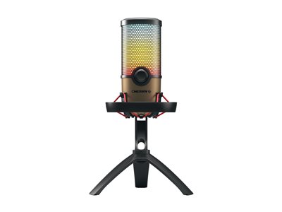 Le CHERRY UM 9.0 PRO RGB séduit par sa conception. Avec son trépied entièrement métallique qui lui assure une bonne stabilité et ses couleurs noir mat et cuivre, ce microphone USB profession-nel attire tous les regards.