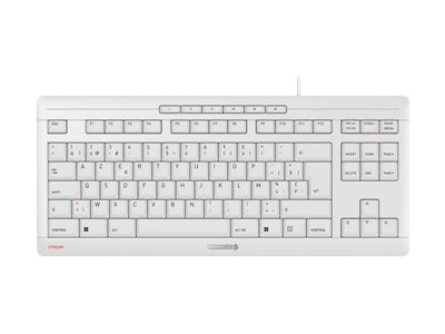 Pour les amateurs de claviers silencieux, le STREAM KEYBOARD TKL est la version réduite du STREAM KEYBOARD classique et procure la même sensation de frappe. Les deux ont un design identique mais diffèrent sensiblement sur un point : sur la version TKL, le pavé numérique a été retiré pour gagner de la place. Ceci est un véritable avantage dans certaines applications.Parmi les similitudes entre ces deux claviers filaires, on trouve la technologie à ciseaux CHERRY SX. Au cœur de la famille STREAM, elle permet aux écrivain.es prolifiques et exigeant.es de travailler de manière productive. Le point de pression est parfait et garantit une frappe précise et silencieuse.Avec un design réduit, sans pavé numérique, le STREAM KEYBOARD TKL est idéal pour ceux qui utilisent peu le pavé numérique et veulent garder une diposition standard. Ce modèle compact permet de gagner de la place, au bureau comme à la maison. Vous n'avez plus qu'à vous concentrer sur l'essentiel. Dans le secteur industriel, ce clavier passe-partout est idéal pour les tiroirs 19 pouces. Dans les environnements difficiles, vous pouvez le protéger avec une membrane WetEx, spécialement adaptée aux dimensions du clavier et disponible en option.Toute personne qui passe chaque jour de longues heures assise à un bureau sait qu'une position ergonomique est essentielle pour prévenir tensions et douleurs au niveau du dos, des mains, des bras et du cou. Les dimensions réduites sont ici un avantage ergonomique. Pour les droitiers, la souris et le clavier sont plus proches. Le bras droit n'a pas besoin d'être écarté, ce qui permet d'adopter une bonne position de travail. Selon l'assurance maladie sociale allemande contre les accidents (DGUV), les claviers TKL favorisent une posture plus naturelle et ergonomique.La certification GS " Sécurité contrôlée " et le label allemand " Blauer Engel " (Ange bleu) décernés pour ce clavier sont une preuve de ces atouts. Le label GS tient compte de toutes les directives et réglementations européennes applicables en matière de protection de la santé. Cela implique, par exemple, que les lettres des touches soient clairement lisibles et le restent – une condition importante pour travailler sans se fatiguer.Le label de protection de l'environnement " Blauer Engel " est un gage de sécurité lorsque l'on veut acheter responsable. Il est une garantie que des normes élevées en matière de propriétés environnementales, sanitaires et fonctionnelles ont été suivies pour le processus de développement du produit. Par exemple, le STREAM KEYBOARD TKL ne contient aucun matériau d'emballage en plastique.Par ailleurs, le CHERRY STREAM TKL dispose aussi de LED d'état très pratiques intégrées aux touches MAJ et DEFIL. Bien que cette caractéristique ne soit généralement utilisée que dans les gammes de prix supérieures, elle est désormais standard sur presque tous les claviers CHERRY. Ce clavier filaire est Plug&Play, prêt à être utilisé sans aucune installation de pilote. 6 touches supplémentaires s'avèrent aussi bien pratiques et utiles au quotidien. Elles permettent de contrôler directement les applications multimédia.Vous passez de nombreuses heures devant votre PC et cherchez un clavier peu encombrant sans pavé numérique ? Vous voulez aussi un clavier avec des normes de qualité élevées et respectant votre santé ? Alors le STREAM KEYBOARD TKL est ce qu'il vous faut.