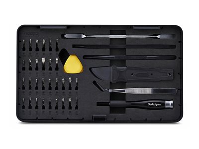 Kit d'outils essentiels pour entretenir et réparer les ordinateurs portables, les smartphones et les tablettes.Ce kit compact fournit aux techniciens des outils de haute qualité nécessaires pour entretenir en toute sécurité et efficacité les ordinateurs portables, de bureau, tablettes et appareils mobiles.Embouts de PrécisionLe kit comprend 30 embouts magnétiques en acier S2, notamment Phillips, Torx, Pentalobe, Hex, Fente, Tri-wing, Triangle, Spanner et éjecteurs de carte SIM. Ces embouts permettent un accès rapide et une compatibilité avec une large gamme d'appareils, des Ultrabooks aux smartphones.Outils d'Ouverture SécurisésCe kit contient une sélection d'outils d'ouverture essentiels, tels que des palettes triangulaires, des spudgers et un outil d'ouverture métallique ergonomique conçu pour les réparations électroniques de précision. Ces outils sont conçus pour séparer les boîtiers en toute sécurité, alliant durabilité, flexibilité et douceur. Les outils en nylon réduisent le risque de décharge électrostatique lors de la manipulation d'électroniques sensibles.Outils pour Travaux de PrécisionLe kit inclut un tournevis en aluminium anodisé avec embout magnétique, doté d'un capuchon rotatif pour un meilleur contrôle du couple et un confort accru, ainsi que des pinces fines coudées idéales pour les espaces restreints, offrant une prise sûre sur les petites vis, connecteurs ou nappes.Couvercle de Boîtier Innovant pour l'Organisation des PiècesPour simplifier les réparations, le couvercle détachable du boîtier fait également office de plateau de tri portable et comprend un tapis magnétique pour maintenir en sécurité les vis et petits composants, gardant l'espace de travail organisé et efficace.