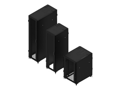 Panneau supérieur, porte avant en verre, ensemble de mise à la terre, kit de baie, panneaux latéraux de verrouillage, porte arrière en métal plein, 4 x rails de montage 19" réglables, chemins de câbles, poignées pivotantes