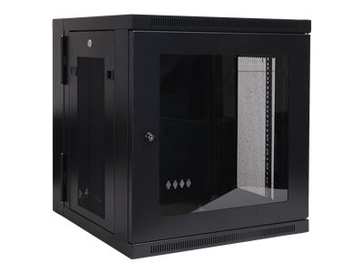 Petite armoire rack à montage mural, profondeur de commutateur et profil compact 12U SmartRack à fenêtre en acrylique transparent et charnières dorsales.