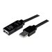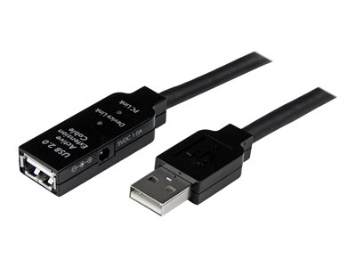 Le câble d'extension USB 2.0 actif USB2AAEXT10M de 10 mètres comporte un connecteur USB de type A mâle et un USB de type A femelle, permettant l'extension active jusqu'à 10 mètres d'appareils USB 2.0.Solution tout-en-un pour contourner les contraintes de distance ainsi que les restrictions quant à l'alimentation, ce câble d'extension USB 2.0 comporte un circuit actif alimenté par bus pour un rendement dépassant les limites de longueur des câbles USB standard.Jusqu'à 4 de ces câbles peuvent être installés en série pour prolonger la connexion USB jusqu'à 40 mètres au total. Au besoin, il est possible d'alimenter l'appareil USB par prise murale à l'aide de l'adaptateur d'alimentation CA universel (fourni avec le câble).Le câble répéteur USB2AAEXT10M prend en charge la totalité de la bande passante USB 2.0 de 480 Mb/s et bénéficie de la garantie StarTech.com de 2 ans.