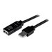 Le câble d'extension USB 2.0 actif USB2AAEXT20M de 20 mètres comporte un connecteur USB de type A mâle et un USB de type A femelle, permettant l'extension active d'appareils USB 2.0 jusqu'à 20 mètres.Solution tout-en-un pour contourner les contraintes de distance ainsi que les restrictions quant à l'alimentation, ce câble d'extension USB 2.0 comporte un circuit actif alimenté par bus pour un rendement dépassant les limites de longueur des câbles USB standard. De plus, il est possible d'en installer deux en série pour prolonger la connexion USB jusqu'à 40 mètres en tout.Au besoin, il est possible d'alimenter l'appareil USB par prise murale à l'aide de l'adaptateur d'alimentation CA universel (fourni avec le câble).Le câble répéteur USB2AAEXT20M prend en charge la totalité de la bande passante USB 2.0 de 480 Mb/s et bénéficie de la garantie StarTech.com de 2 ans.