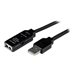 Le câble d'extension USB 2.0 actif USB2AAEXT35M de 35 mètres comporte un connecteur USB de type A mâle et un USB de type A femelle, permettant l'extension jusqu'à 35 mètres d'appareils USB 2.0.Solution tout-en-un pour contourner les contraintes de distance ainsi que les restrictions quant à l'alimentation, ce câble d'extension USB 2.0 comporte un circuit actif alimenté par bus pour un rendement dépassant les limites de longueur des câbles USB standard. Au besoin, il est possible d'alimenter l'appareil USB par prise murale à l'aide de l'adaptateur d'alimentation CA universel fourni avec le câble.Le câble d'extension (extendeur USB) USB2AAEXT35M prend en charge des vitesses de transfert jusqu'à 480 Mb/s et bénéficie de la garantie de 2 ans de StarTech.com.
