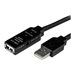 Le câble d'extension USB 2.0 actif USB2AAEXT5M de 5 mètres comporte un connecteur USB de type A mâle et un USB de type A femelle, permettant l'extension active d'appareils USB 2.0 jusqu'à 5 mètres.Solution tout-en-un pour contourner les contraintes de distance ainsi que les restrictions quant à l'alimentation, ce câble d'extension USB 2.0 comporte un circuit actif alimenté par bus pour un rendement dépassant les limites de longueur des câbles USB standard. De plus, il est possible d'en installer quatre en série pour prolonger la connexion USB jusqu'à 20 mètres en tout.Au besoin, le câble se branche dans une prise murale à l'aide de l'adaptateur d'alimentation CA universel (fourni avec le câble). Vous pourrez ainsi utiliser des appareils alimentés par USB qui exigent davantage de courant.Le câble répéteur USB2AAEXT5M prend en charge la totalité de la bande passante USB 2.0 de 480 Mb/s et bénéficie de la garantie StarTech.com de 2 ans.